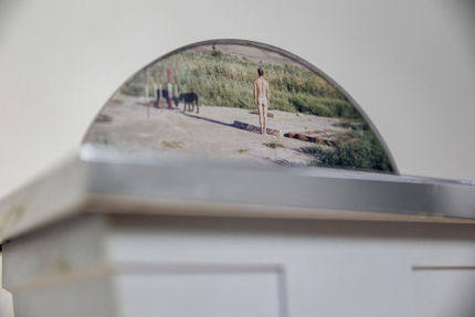 The image shows a nude artist in the Sea of Galilee, in Israel. The set scenario indicates a wasteland with delimitated territories, guard dogs and the gesture of waiting. The mechanism allows one to rotate the image into the box closing the scene within and making it disappear . It indicates the relationship between the boundaries seeing in the set and the physical boundary of the box.